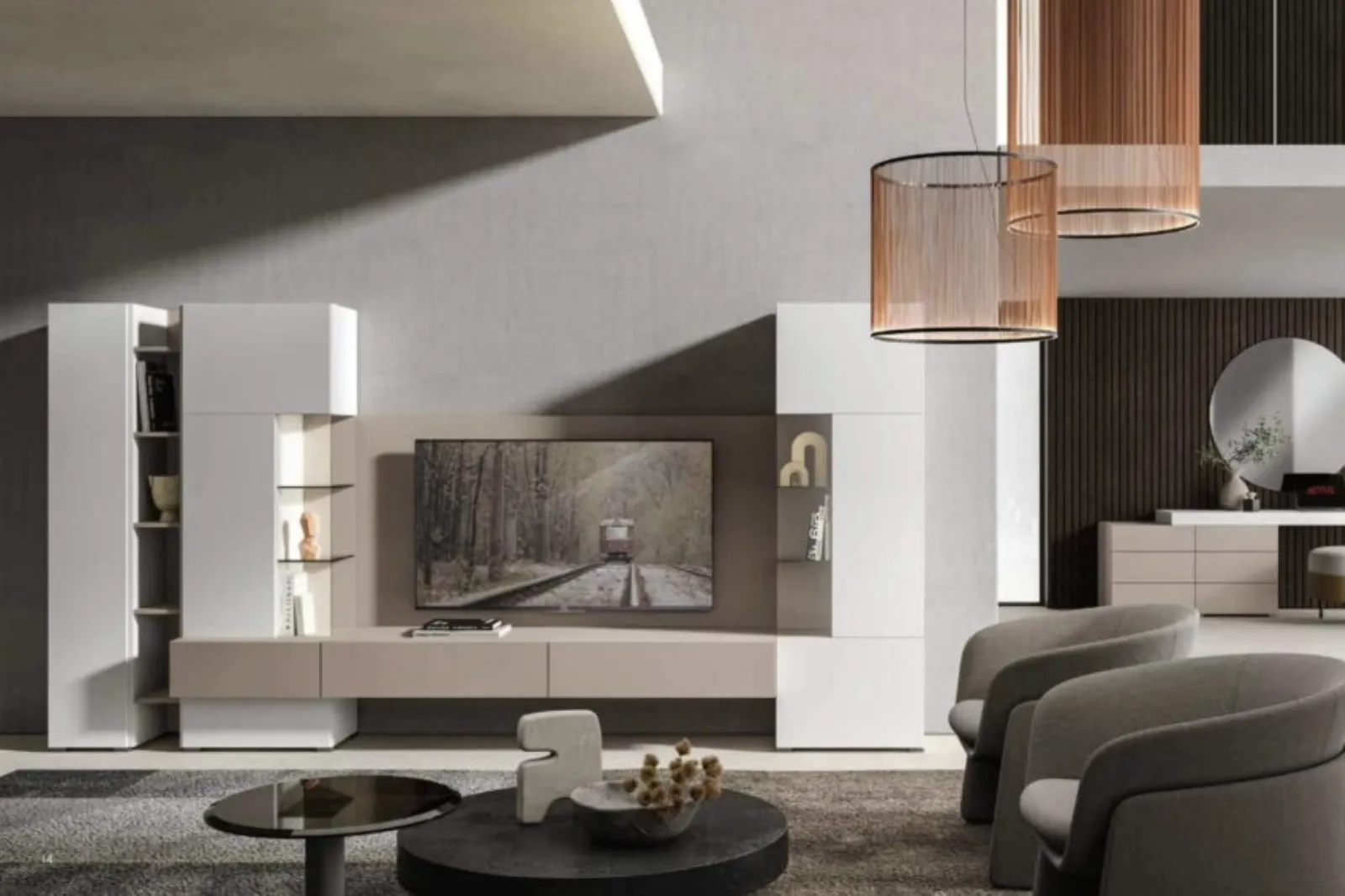 Artigianmobili mette a disposizione originali modelli di mobili soggiorno, diversi per stile e conformazioni, finiture e elementi: scopri nel nostro punto vendita l'Arredamento Casa delle migliori marche. I mobili soggiorno in melaminico dalle linee moderne come il modello in foto sono veramente eclettici e capaci di arredare la zona giorno usufruendo al meglio di ogni angolo. Visto che il soggiorno deve essere uno spazio funzionale e di grande valore estetico, sono necessari alcuni arredi belli e pratici come le Pareti Attrezzate. La Parete Attrezzata Velvet 4-0 H4 di Artigianmobili in foto è una tra le più belle soluzioni d’arredo in commercio: componibilità personalizzabile e le varie opportunità di progettazione la rendono funzionale ed esteticamente gradevole.